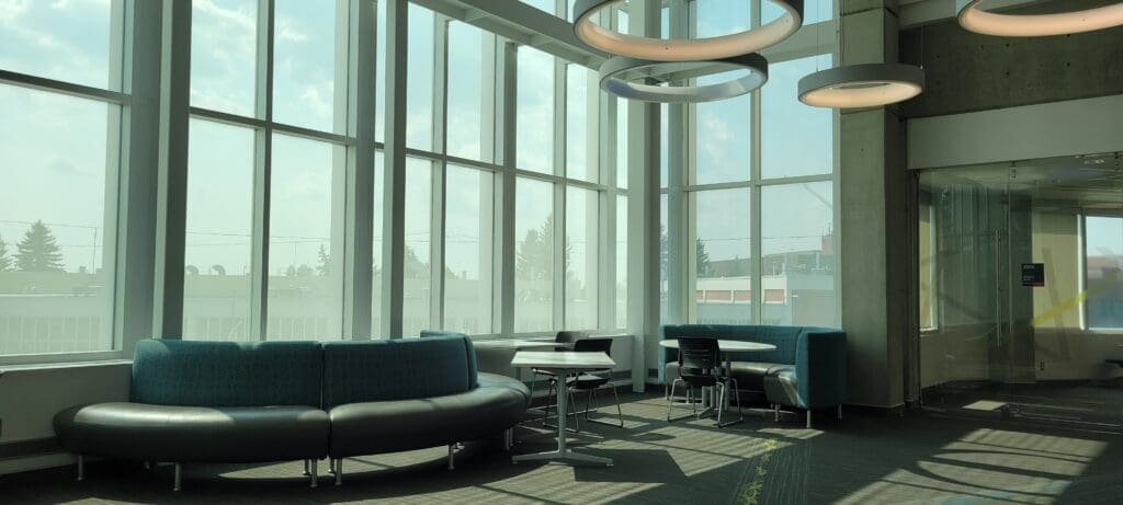 The George and Gay Andrews study lounge is located in the Feltham Centre, or its other name the CAT building, on Main Campus. You won’t miss it when you reach the second floor! It is an open study space and its walls are NAIT’s vibrant blue with NAIT-themed motifs. You’ll study in the NAIT spirit. There is a printer near a wall and a whiteboard. LED lights are said to help to reduce the energy used in this space as well. This study spot has a nice view of CAT’s lower and upper floors and others going about their day.