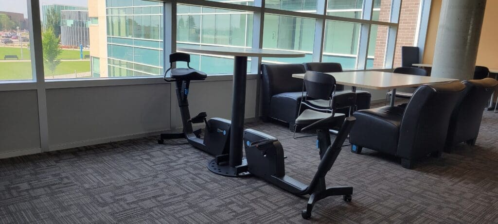 Low-intensity exercise and studying combine in this category. Active Study Spaces in the Feltham Centre and various other locations across campus create a low-intensity exercise meets studying experience for students. The setup in the Feltham Centre has two exercise bikes or under-desk bikes connected together with a high circular table for you and a friend. If you prefer to study while walking, the McNally Library has a treadmill with a desk located on a wall near the Makerspace.