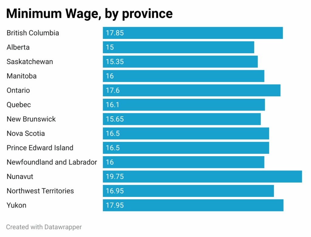 On Oct. 1, five provinces across the country raised their minimum wages, making Alberta’s the lowest in Canada. Saskatchewan, Manitoba, Nova Scotia, Ontario and P.E.I. now have minimum wages above $15 per hour.