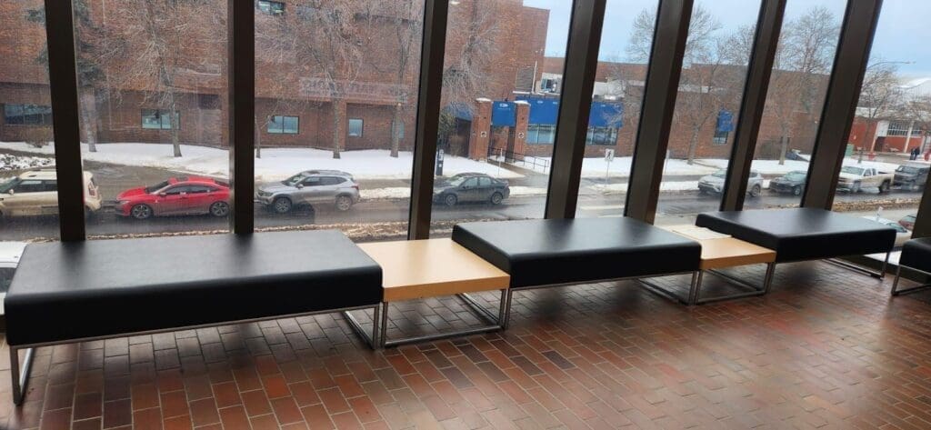 These benches are located outside the theatre in front of large windows. When the venue is not in use, there are usually not many people there.
