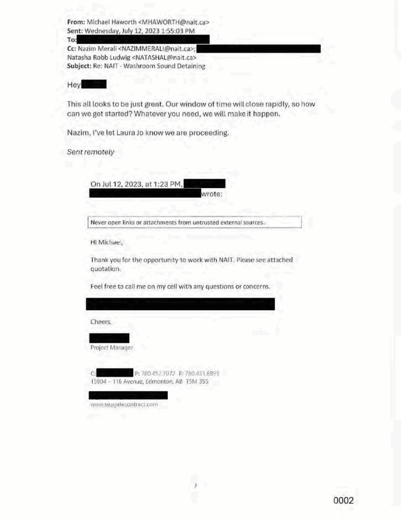 Instead of going through NAIT’s FMD department, records show this project was received and approved by two former NAIT staff: Michael Haworth (former Chief of Staff and Director of Strategy) and Nazim Merali (former VP Administration and Chief Financial Officer).