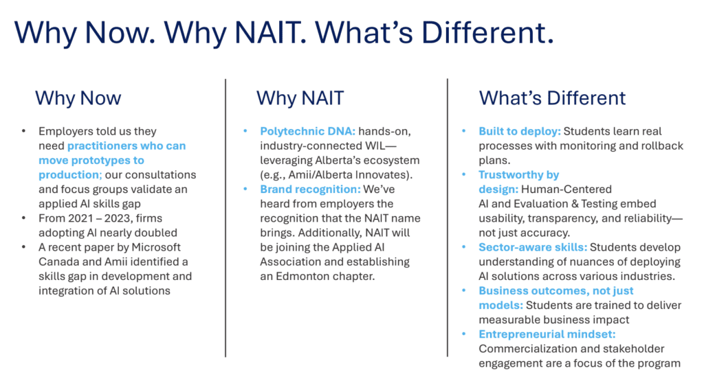 According to the program proposal obtained by the Nugget, 70 students and grads from NAIT’s School of Media and Information Technology were surveyed about the proposed diploma, and “results demonstrated clear alignment” between student needs and an Applied AI program.