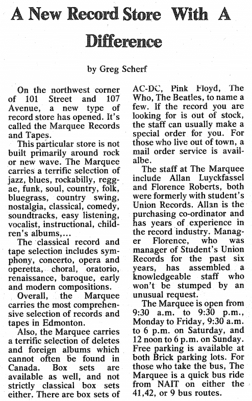 In his article, headlined “A New Record Store With A Difference,” he explained that the store was different than others of the time, focusing on more genres than just rock and new wave. The article gives information important to the students of NAIT, such as store hours and direct bus routes from NAIT to The Marquee. This article is a blast from the past of not only NAIT and Nugget history, but also in the music store industry. While The Marquee is unfortunately no longer around, Edmonton has since come to be home to many other record shops, like Blackbyrd Myoozik. Located on Whyte Avenue, Blackbyrd was founded in 1993 by Arthur Fahard and Mark Davis and is a short LRT ride away for NAIT students. If you’re a fan of live music, they even sometimes have bands playing live. Even though it was 34 years ago, this 1983 piece shows that record stores are still a relevant part of our community.